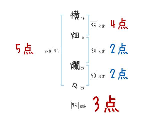 天運![]() | 横畑爛々さんの天運は25画の4つ星!個性があり才能があふれる。強運の持ち主で発展する。 家系が持つ宿命的な運勢を表します。祖先から受け継いだ苗字ですので自分の力が及びません。家柄を象徴します。 |
