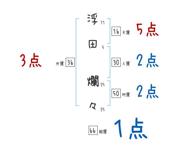 天運![]() | 浮田爛々さんの天運は16画の5つ星!人望が厚く大きく発展する。逆転成功が見える。 家系が持つ宿命的な運勢を表します。祖先から受け継いだ苗字ですので自分の力が及びません。家柄を象徴します。 |