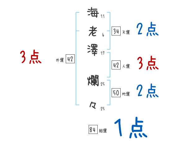外運![]() | 海老澤爛々さんの外運は42画の3つ星!病気に注意。多芸であるが消極的でおとなしい。 生活面を象徴する運勢です。外部から受ける影響力を表し、結婚運、家庭運や職場、環境への順応性を表します。 |