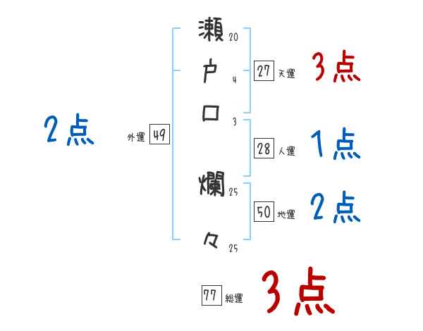 総運![]() | 瀬戸口爛々さんの総運は77画の3つ星!多少不安定であるが晩年は吉。不屈の精神。 あなたの人生を表す1番重要な運勢です。生涯を通じて影響する総合運となり、主に50歳以降の晩年期に影響を及ぼします。 |