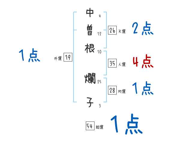 外運![]() | 中曽根爛子さんの外運は19画の1つ星!優れた才能を持ちますが、協調性が足りないことも。周りの人と協力する事を意識しましょう。 生活面を象徴する運勢です。外部から受ける影響力を表し、結婚運、家庭運や職場、環境への順応性を表します。 |