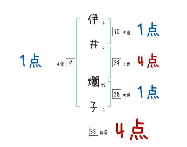 地運![]() | 伊井爛子さんの地運は28画の1つ星!家庭環境に注意。スポーツで活躍できる能力があるかも。 個性を表す基礎的な運勢です。性格形成や対人関係、行動力など家庭環境に影響されます。主に誕生してから20歳くらいまでの若年期の運勢を表します。 |