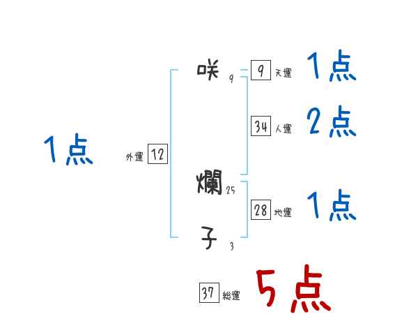 天運![]() | 咲爛子さんの天運は9画の1つ星!消極的で才能を発揮することが苦手なことも。周りの意見に耳を傾けましょう。 家系が持つ宿命的な運勢を表します。祖先から受け継いだ苗字ですので自分の力が及びません。家柄を象徴します。 |