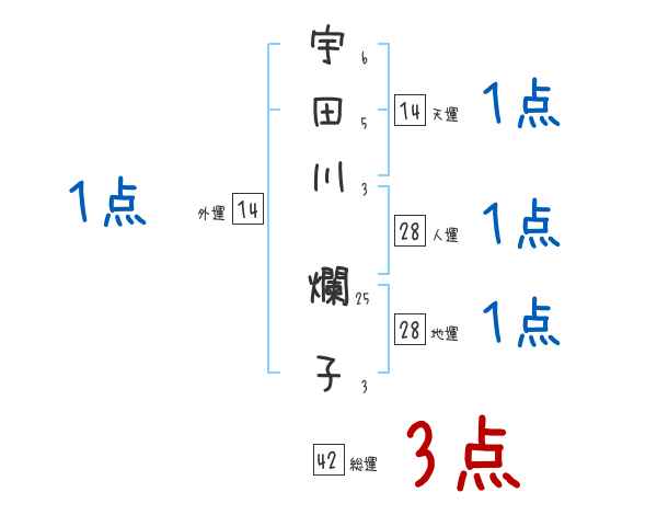 天運![]() | 宇田川爛子さんの天運は14画の1つ星!人に対して優しいがストレスを溜め込みがち。人間関係のトラブルを避けるよう気をつけましょう。 家系が持つ宿命的な運勢を表します。祖先から受け継いだ苗字ですので自分の力が及びません。家柄を象徴します。 |