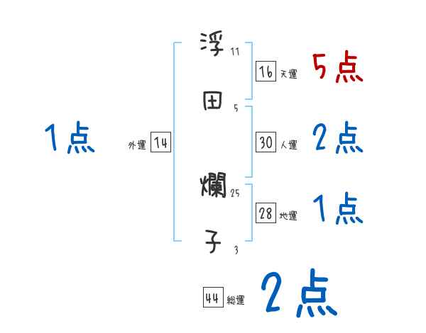 外運![]() | 浮田爛子さんの外運は14画の1つ星!人に対して優しいがストレスを溜め込みがち。人間関係のトラブルを避けるよう気をつけましょう。 生活面を象徴する運勢です。外部から受ける影響力を表し、結婚運、家庭運や職場、環境への順応性を表します。 |