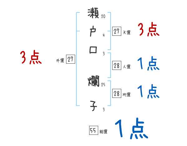 天運![]() | 瀬戸口爛子さんの天運は27画の3つ星!頭脳明晰だが強情で摩擦が多い傾向。孤立に注意。 家系が持つ宿命的な運勢を表します。祖先から受け継いだ苗字ですので自分の力が及びません。家柄を象徴します。 |