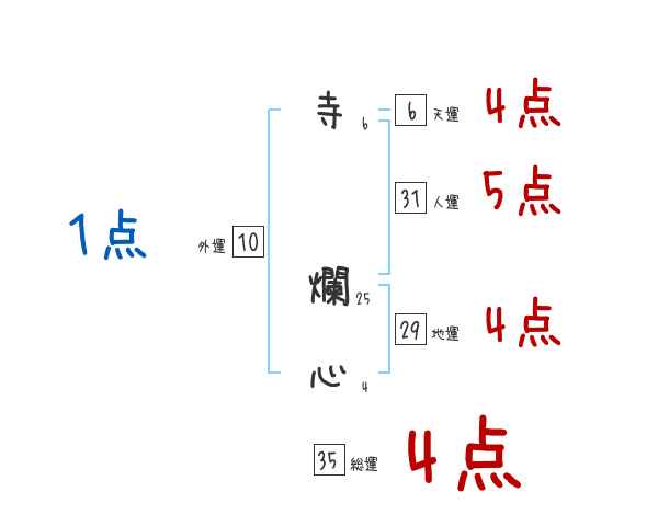 天運![]() | 寺爛心さんの天運は6画の4つ星!慎重な努力家で信頼を得る。誠実な精神で向上心に優れる。 家系が持つ宿命的な運勢を表します。祖先から受け継いだ苗字ですので自分の力が及びません。家柄を象徴します。 |