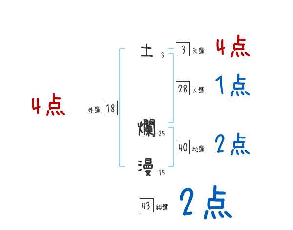 天運![]() | 土爛漫さんの天運は3画の4つ星!活動的で才能に恵まれ、多くの信頼を得る。希望に満ち成長する。 家系が持つ宿命的な運勢を表します。祖先から受け継いだ苗字ですので自分の力が及びません。家柄を象徴します。 |