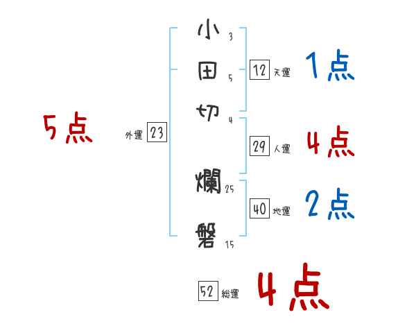 天運![]() | 小田切爛磐さんの天運は12画の1つ星!簡単な失敗で諦めてしまいやすいかも。着実に行動すると良いでしょう。 家系が持つ宿命的な運勢を表します。祖先から受け継いだ苗字ですので自分の力が及びません。家柄を象徴します。 |