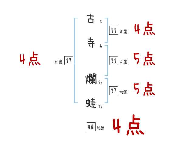 天運![]() | 古寺爛蛙さんの天運は11画の4つ星!着実に富や地位を得る幸運な人生。 家系が持つ宿命的な運勢を表します。祖先から受け継いだ苗字ですので自分の力が及びません。家柄を象徴します。 |