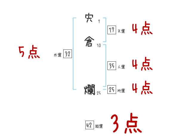 外運![]() | 宍倉爛さんの外運は32画の5つ星!柔軟性があり成功する。チャンスが多く金運が良い。 生活面を象徴する運勢です。外部から受ける影響力を表し、結婚運、家庭運や職場、環境への順応性を表します。 |