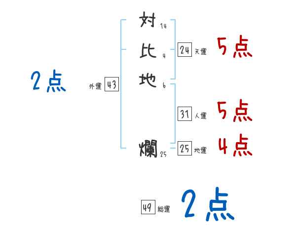 総運![]() | 対比地爛さんの総運は49画の2つ星!不安定な性格で明暗がある人生。周りの人には支援されやすい。 あなたの人生を表す1番重要な運勢です。生涯を通じて影響する総合運となり、主に50歳以降の晩年期に影響を及ぼします。 |