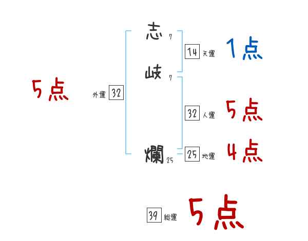 外運![]() | 志岐爛さんの外運は32画の5つ星!柔軟性があり成功する。チャンスが多く金運が良い。 生活面を象徴する運勢です。外部から受ける影響力を表し、結婚運、家庭運や職場、環境への順応性を表します。 |