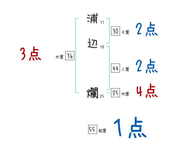 外運![]() | 浦辺爛さんの外運は36画の3つ星!先見性が豊かです。多少神経質で苦労することも。 生活面を象徴する運勢です。外部から受ける影響力を表し、結婚運、家庭運や職場、環境への順応性を表します。 |
