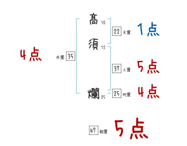 天運![]() | 髙須爛さんの天運は22画の1つ星!努力することが苦手ないっぽう手先が器用。芸術性にも優れる。 家系が持つ宿命的な運勢を表します。祖先から受け継いだ苗字ですので自分の力が及びません。家柄を象徴します。 |