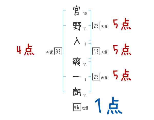 天運![]() | 宮野入爽一朗さんの天運は23画の5つ星!想像力に優れ活力がある。一代で成功し名誉を手に入れる。 家系が持つ宿命的な運勢を表します。祖先から受け継いだ苗字ですので自分の力が及びません。家柄を象徴します。 |