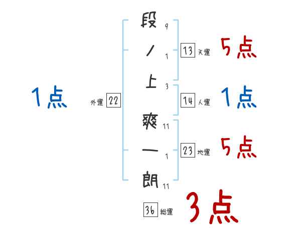 天運![]() | 段ノ上爽一朗さんの天運は13画の5つ星!才能に恵まれ人気がある。名声を手に入れる。円満な人生。 家系が持つ宿命的な運勢を表します。祖先から受け継いだ苗字ですので自分の力が及びません。家柄を象徴します。 |