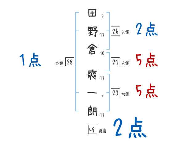 総運![]() | 田野倉爽一朗さんの総運は49画の2つ星!不安定な性格で明暗がある人生。周りの人には支援されやすい。 あなたの人生を表す1番重要な運勢です。生涯を通じて影響する総合運となり、主に50歳以降の晩年期に影響を及ぼします。 |