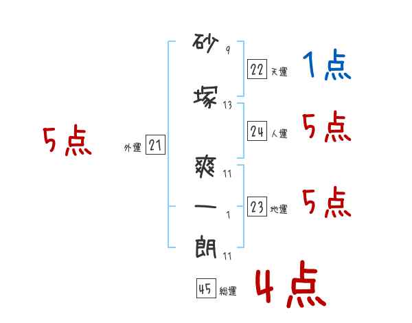 外運![]() | 砂塚爽一朗さんの外運は21画の5つ星!統率力がある。独立し成功する。名誉を手に入れる。 生活面を象徴する運勢です。外部から受ける影響力を表し、結婚運、家庭運や職場、環境への順応性を表します。 |