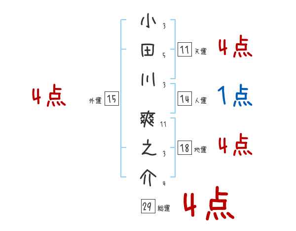 天運![]() | 小田川爽之介さんの天運は11画の4つ星!着実に富や地位を得る幸運な人生。 家系が持つ宿命的な運勢を表します。祖先から受け継いだ苗字ですので自分の力が及びません。家柄を象徴します。 |