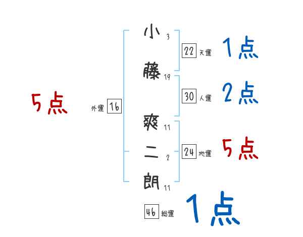総運![]() | 小藤爽二朗さんの総運は46画の1つ星!迷走することが多く苦労するかも。目先のことにとらわれないように。 あなたの人生を表す1番重要な運勢です。生涯を通じて影響する総合運となり、主に50歳以降の晩年期に影響を及ぼします。 |