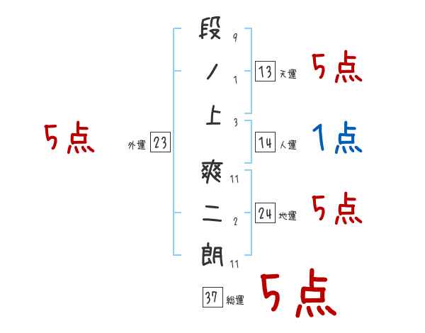 天運![]() | 段ノ上爽二朗さんの天運は13画の5つ星!才能に恵まれ人気がある。名声を手に入れる。円満な人生。 家系が持つ宿命的な運勢を表します。祖先から受け継いだ苗字ですので自分の力が及びません。家柄を象徴します。 |