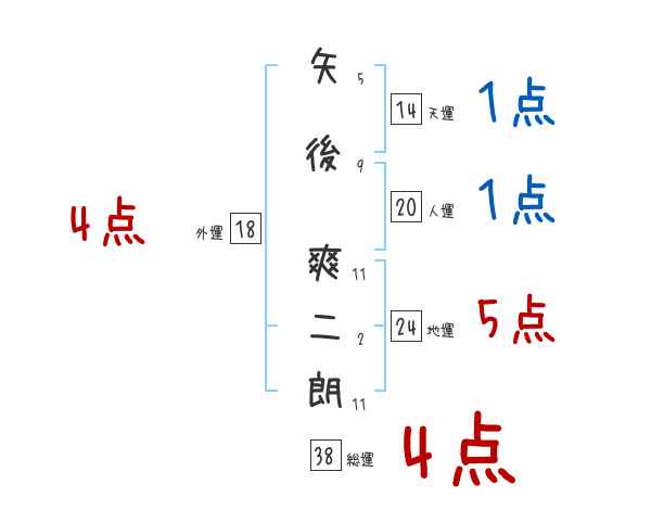 外運![]() | 矢後爽二朗さんの外運は18画の4つ星!情熱的で剛気。忍耐力があり信頼される。 生活面を象徴する運勢です。外部から受ける影響力を表し、結婚運、家庭運や職場、環境への順応性を表します。 |