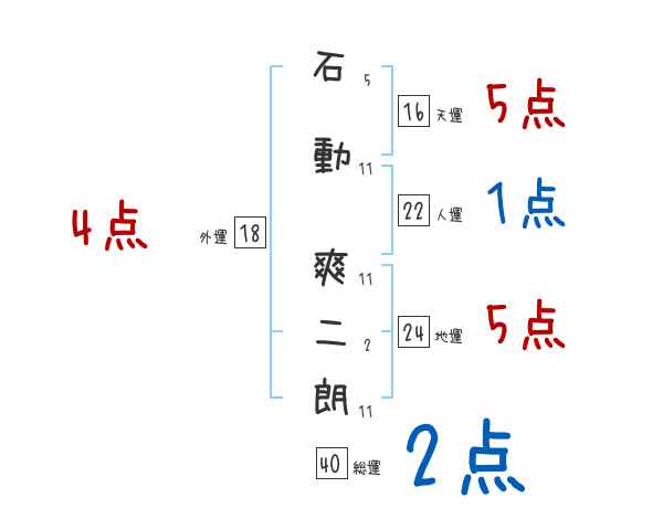 人運![]() | 石動爽二朗さんの人運は22画の1つ星!努力することが苦手ないっぽう手先が器用。芸術性にも優れる。 性格や才能などを表す2番目に重要な運勢です。人間関係や協調性、社会的な成功に影響します。主に20歳から50歳ぐらいまでの中年期の運勢を表します。 |