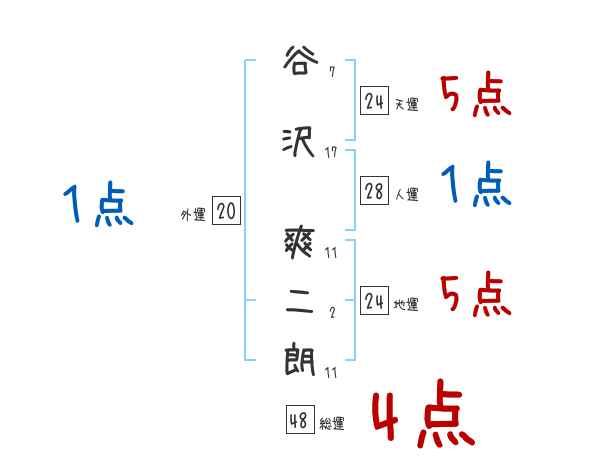 天運![]() | 谷沢爽二朗さんの天運は24画の5つ星!家庭運が良く順調な人生。金運にも恵まれる。 家系が持つ宿命的な運勢を表します。祖先から受け継いだ苗字ですので自分の力が及びません。家柄を象徴します。 |