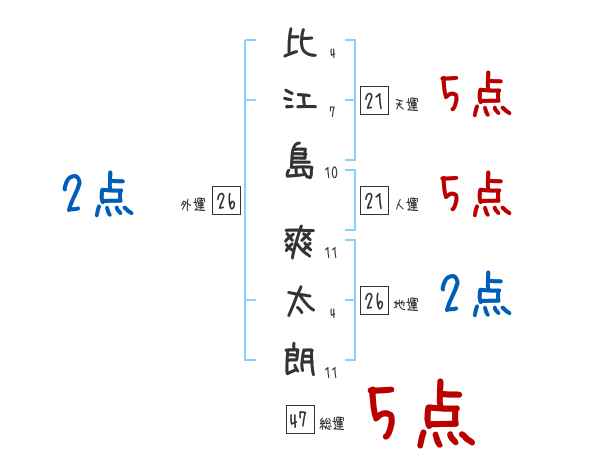 総運![]() | 比江島爽太朗さんの総運は47画の5つ星!実力が開花し発展する円満な人生。財に恵まれる。 あなたの人生を表す1番重要な運勢です。生涯を通じて影響する総合運となり、主に50歳以降の晩年期に影響を及ぼします。 |