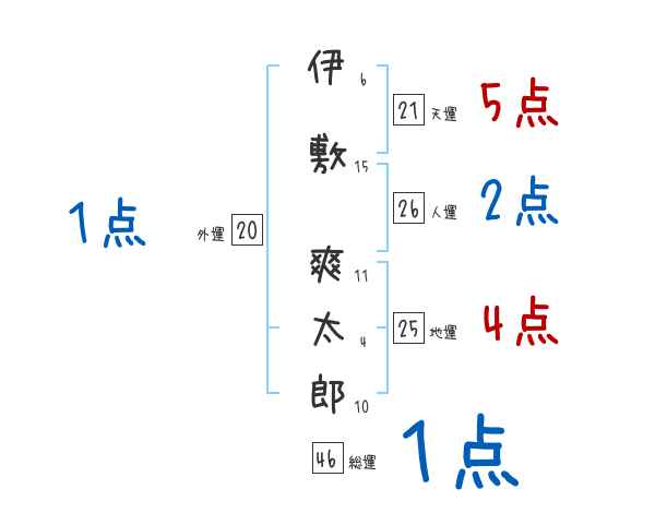 天運![]() | 伊敷爽太郎さんの天運は21画の5つ星!統率力がある。独立し成功する。名誉を手に入れる。 家系が持つ宿命的な運勢を表します。祖先から受け継いだ苗字ですので自分の力が及びません。家柄を象徴します。 |