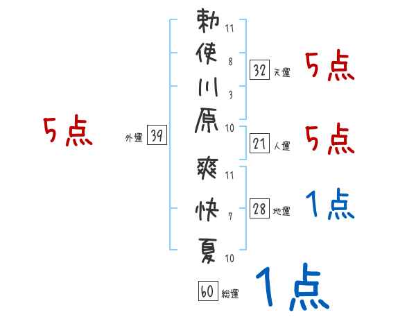 外運![]() | 勅使川原爽快夏さんの外運は39画の5つ星!社交性に優れ人望が厚い。人の上に立ち成功する。 生活面を象徴する運勢です。外部から受ける影響力を表し、結婚運、家庭運や職場、環境への順応性を表します。 |