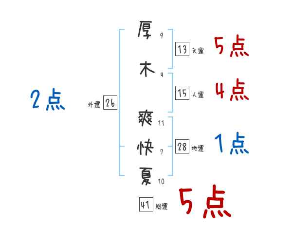 天運![]() | 厚木爽快夏さんの天運は13画の5つ星!才能に恵まれ人気がある。名声を手に入れる。円満な人生。 家系が持つ宿命的な運勢を表します。祖先から受け継いだ苗字ですので自分の力が及びません。家柄を象徴します。 |