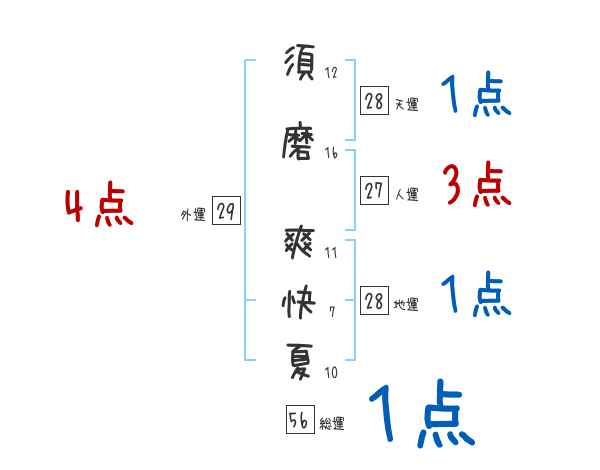 天運![]() | 須磨爽快夏さんの天運は28画の1つ星!家庭環境に注意。スポーツで活躍できる能力があるかも。 家系が持つ宿命的な運勢を表します。祖先から受け継いだ苗字ですので自分の力が及びません。家柄を象徴します。 |