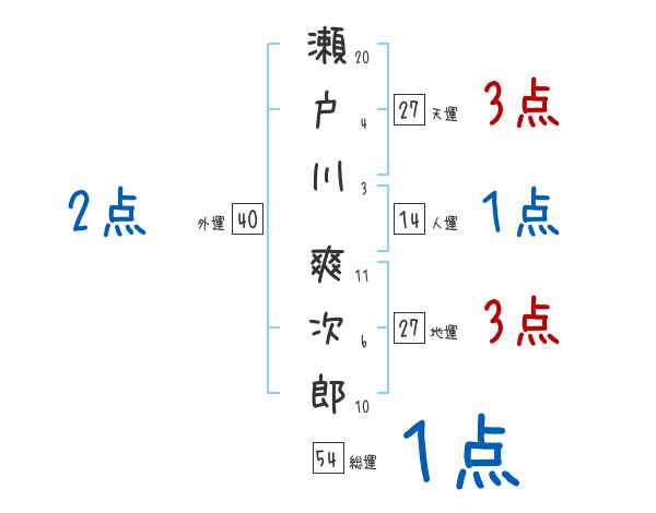 総運![]() | 瀬戸川爽次郎さんの総運は54画の1つ星!トラブルが多いかも。周りをよく見て協調して過ごしましょう。 あなたの人生を表す1番重要な運勢です。生涯を通じて影響する総合運となり、主に50歳以降の晩年期に影響を及ぼします。 |