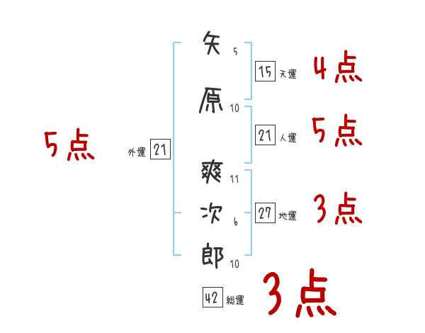 外運![]() | 矢原爽次郎さんの外運は21画の5つ星!統率力がある。独立し成功する。名誉を手に入れる。 生活面を象徴する運勢です。外部から受ける影響力を表し、結婚運、家庭運や職場、環境への順応性を表します。 |