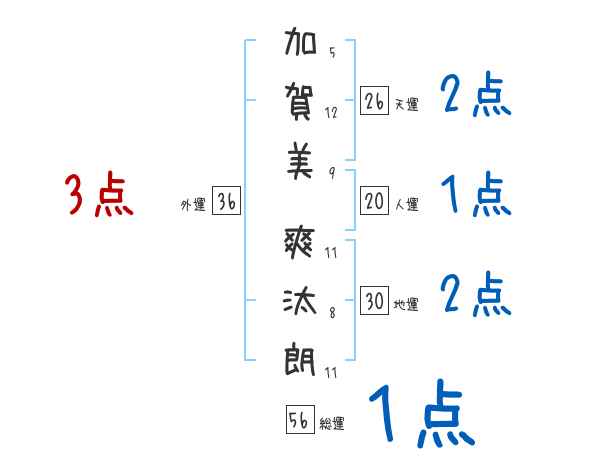 総運![]()  | 加賀美爽汰朗さんの総運は56画の1つ星!消極的で無気力になりがち。誠実な気持ちが必要でしょう。 あなたの人生を表す1番重要な運勢です。生涯を通じて影響する総合運となり、主に50歳以降の晩年期に影響を及ぼします。 |