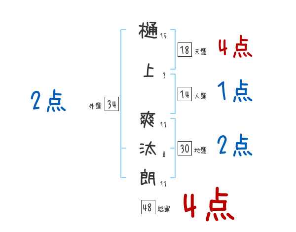 天運![]() | 樋上爽汰朗さんの天運は18画の4つ星!情熱的で剛気。忍耐力があり信頼される。 家系が持つ宿命的な運勢を表します。祖先から受け継いだ苗字ですので自分の力が及びません。家柄を象徴します。 |
