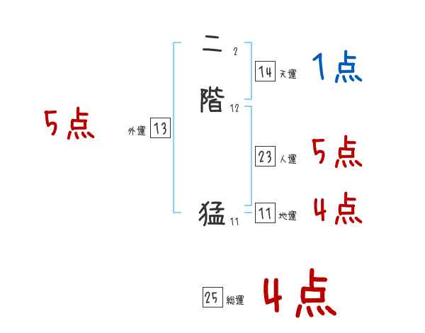 外運![]() | 二階猛さんの外運は13画の5つ星!才能に恵まれ人気がある。名声を手に入れる。円満な人生。 生活面を象徴する運勢です。外部から受ける影響力を表し、結婚運、家庭運や職場、環境への順応性を表します。 |