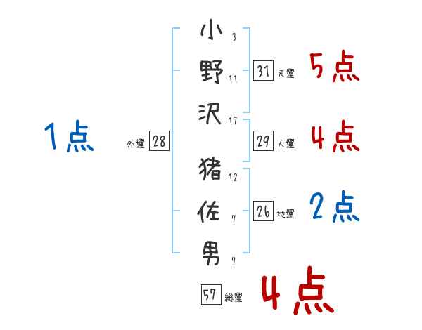 総運![]() | 小野沢猪佐男さんの総運は57画の4つ星!向上心があり人望がある。地位を得る。 あなたの人生を表す1番重要な運勢です。生涯を通じて影響する総合運となり、主に50歳以降の晩年期に影響を及ぼします。 |