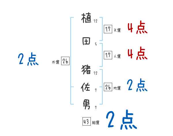 外運![]() | 植田猪佐男さんの外運は26画の2つ星!波瀾万丈かも。信頼できる人を大事にしましょう。 生活面を象徴する運勢です。外部から受ける影響力を表し、結婚運、家庭運や職場、環境への順応性を表します。 |