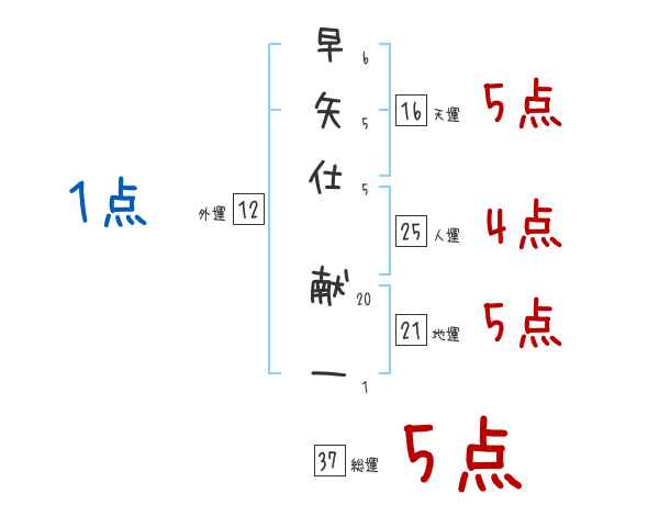 天運![]() | 早矢仕献一さんの天運は16画の5つ星!人望が厚く大きく発展する。逆転成功が見える。 家系が持つ宿命的な運勢を表します。祖先から受け継いだ苗字ですので自分の力が及びません。家柄を象徴します。 |