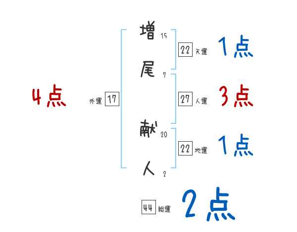 総運![]() | 増尾献人さんの総運は44画の2つ星!誠実で慎重な性格。物事を考えすぎないように注意しましょう。 あなたの人生を表す1番重要な運勢です。生涯を通じて影響する総合運となり、主に50歳以降の晩年期に影響を及ぼします。 |