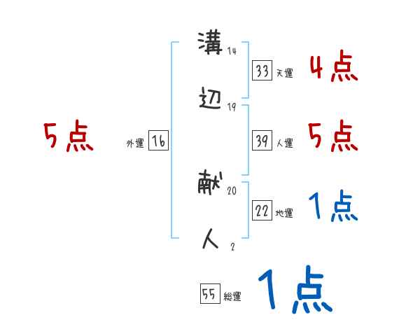 外運![]() | 溝辺献人さんの外運は16画の5つ星!人望が厚く大きく発展する。逆転成功が見える。 生活面を象徴する運勢です。外部から受ける影響力を表し、結婚運、家庭運や職場、環境への順応性を表します。 |