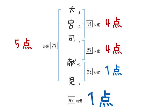 地運![]() | 大宮司献児さんの地運は28画の1つ星!家庭環境に注意。スポーツで活躍できる能力があるかも。 個性を表す基礎的な運勢です。性格形成や対人関係、行動力など家庭環境に影響されます。主に誕生してから20歳くらいまでの若年期の運勢を表します。 |
