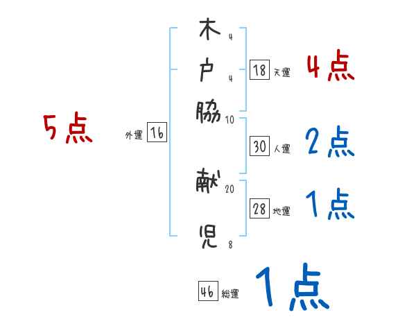 外運![]() | 木戸脇献児さんの外運は16画の5つ星!人望が厚く大きく発展する。逆転成功が見える。 生活面を象徴する運勢です。外部から受ける影響力を表し、結婚運、家庭運や職場、環境への順応性を表します。 |