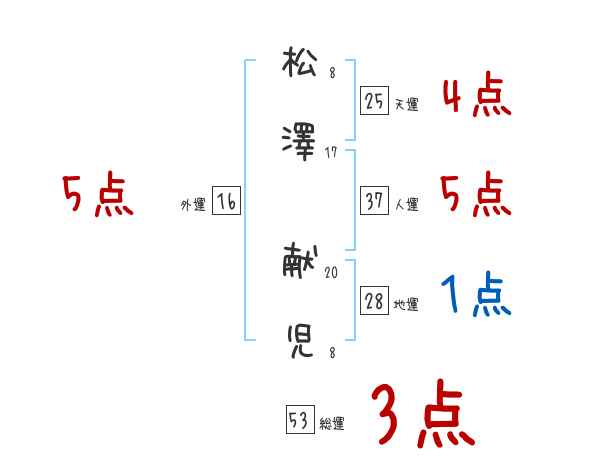 外運![]() | 松澤献児さんの外運は16画の5つ星!人望が厚く大きく発展する。逆転成功が見える。 生活面を象徴する運勢です。外部から受ける影響力を表し、結婚運、家庭運や職場、環境への順応性を表します。 |