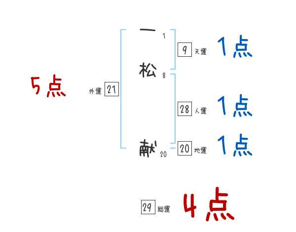 天運![]() | 一松献さんの天運は9画の1つ星!消極的で才能を発揮することが苦手なことも。周りの意見に耳を傾けましょう。 家系が持つ宿命的な運勢を表します。祖先から受け継いだ苗字ですので自分の力が及びません。家柄を象徴します。 |