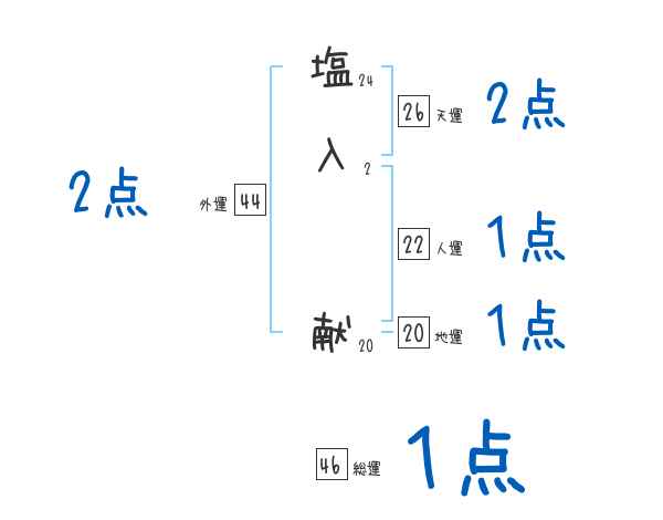 外運![]() | 塩入献さんの外運は44画の2つ星!誠実で慎重な性格。物事を考えすぎないように注意しましょう。 生活面を象徴する運勢です。外部から受ける影響力を表し、結婚運、家庭運や職場、環境への順応性を表します。 |
