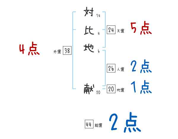 総運![]() | 対比地献さんの総運は44画の2つ星!誠実で慎重な性格。物事を考えすぎないように注意しましょう。 あなたの人生を表す1番重要な運勢です。生涯を通じて影響する総合運となり、主に50歳以降の晩年期に影響を及ぼします。 |